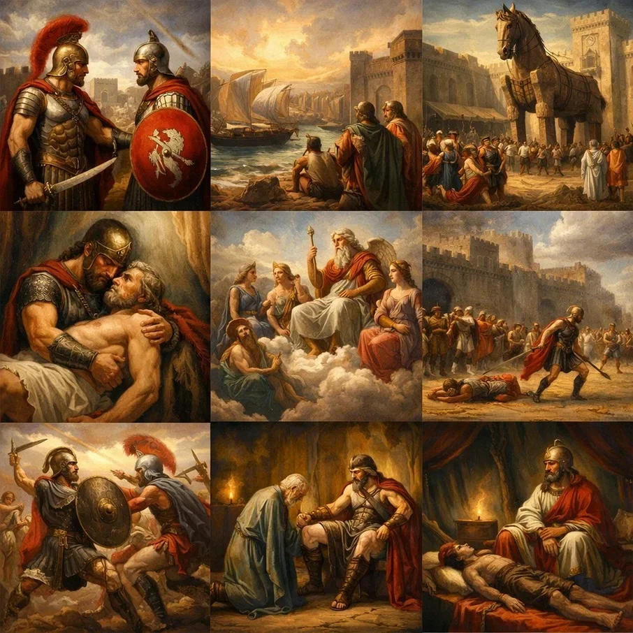 Троянская война – это эпицентр греческой мифологии, вокруг которой выстраивается вся современная культура.Гомер – безвестный автор, который в конце поэмы оплакивает умершего врага. В перипетиях сюжета участвуют боги, разделившиеся на два лагеря: одни загреков, другие за троянцев. В поэме можно увидеть мистерию, во время которой происходит смена земной жизни на божественную. Только в конце произведения обе эти жизни сливаются в одну сюжетную линию.